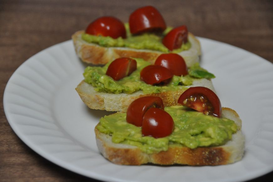 Spread avocado on the toasted bread and top with tomatoes.