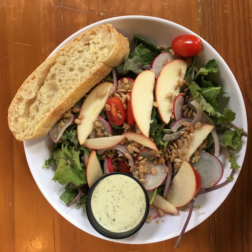Lola—An American Bistro was my go-to for lunch and coffee breaks.  It has an urban funky coffeehouse ambiance with the benefits of a small town atmosphere—I was amazed by how many people left their laptops unattended on the tables while they wandered off to order food or chat with friends (sadly, this is not something I can do at home in Minneapolis).  Lola's has a breakfast menu that includes egg dishes, sandwiches, waffles, and pancakes, and lunch and dinner options range from salads and sandwiches to pasta and pot pies.  I enjoyed the baby kale salad, which includes apples and a hearty helping of quinoa and is served with a delicious green goddess dressing.