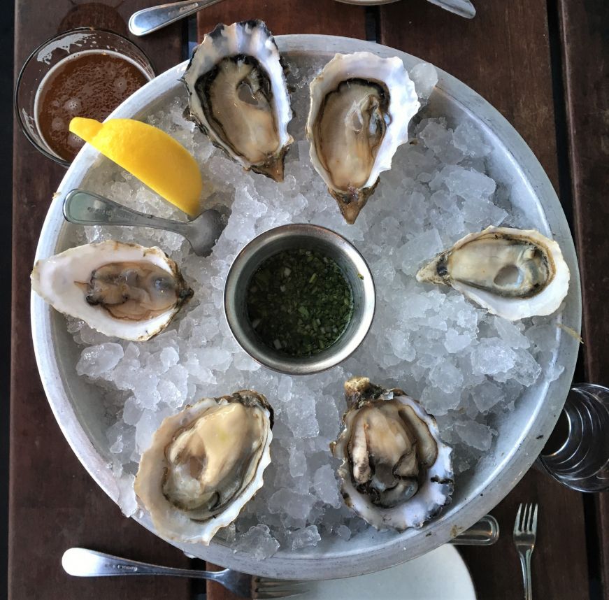 6:15pm: Mike and I decide to walk to the Ferry Building for dinner, since we want to eat by the ocean and I've already spent the morning at Fisherman's Wharf. A former transportation terminal that's been repurposed as a food hall, the Ferry Building is located in the Embarcadero neighborhood near the Bay Bridge. I'm in the mood for seafood, so we get in line for a table at Hog Island Oyster Co., which is a company that farms oysters and operates a handful of oyster bars.