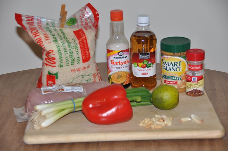 Serve pork over jasmine rice, topped with the sauteed red bell pepper, peanuts, and green onions, with a lime wedge.