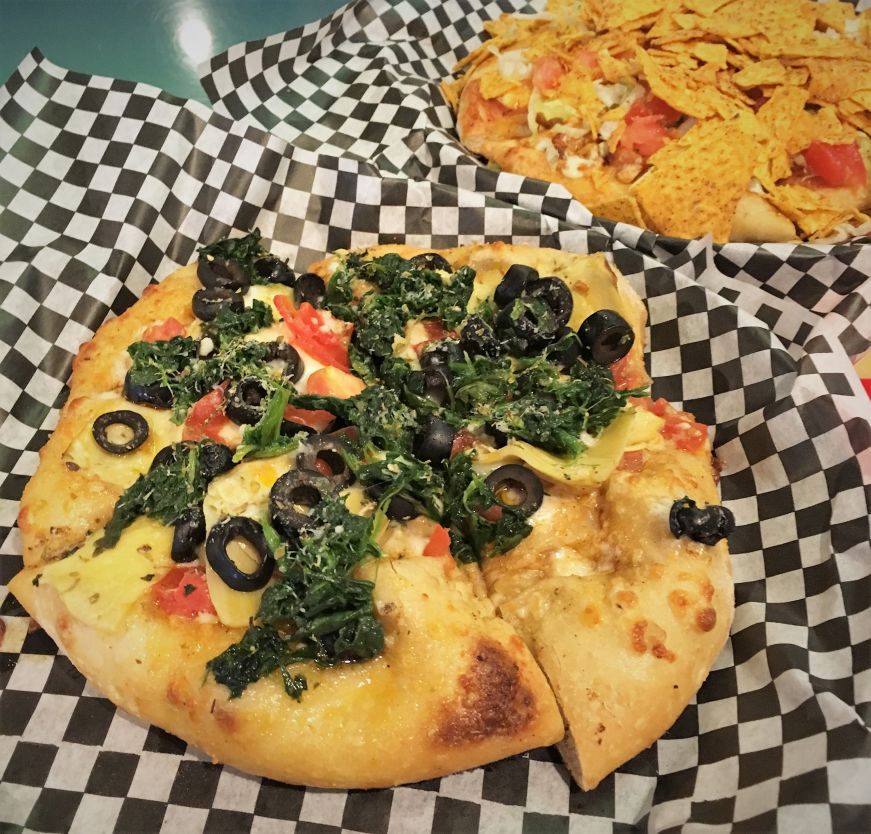 Since the pizzas were personal-sized, they weren't cut into strips. However, they had all the other hallmarks of a Quad City-style pizza, and I especially loved the savory, slightly nutty crust. It had an unusual texture, quite crisp on the outside and very soft on the inside. The Shut Out Taco pizza was topped with Doritos-style chips, which seem like a gimmick at first but the crunchy texture really did add some nice additional texture. They also made the pizza very messy to eat—grab extra napkins! The garlic sauce on the Grecian Goalie pizza paired nicely with the spinach and olives.