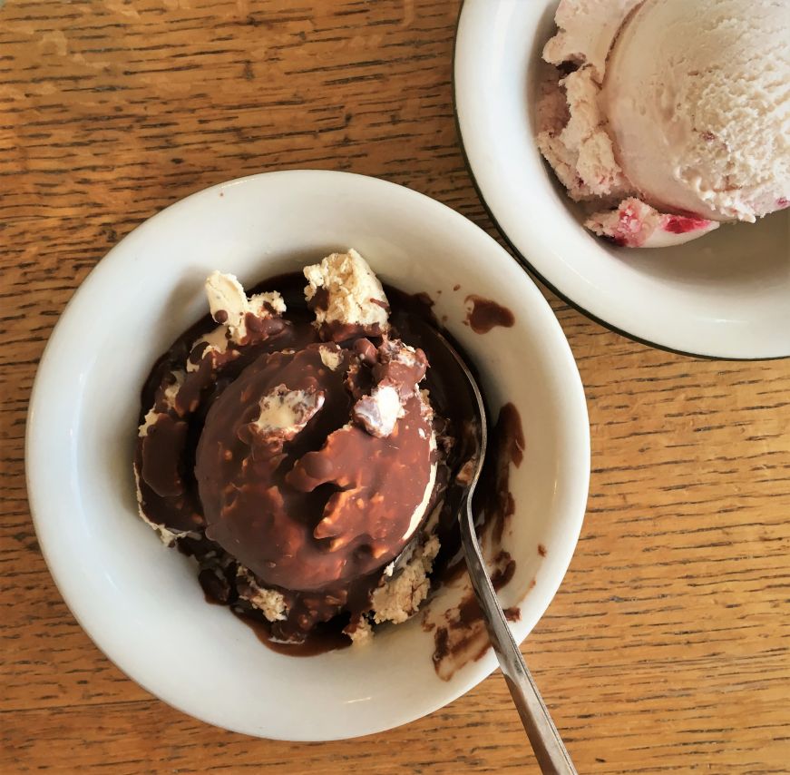 We appreciated that ice cream is served in ceramic bowls with metal spoons—it made our ice cream feel like more of a treat, and encouraged us to sit down and savor it. The reusable dishes are also better for the environment, and I noticed that the shop also uses wooden spoons instead of plastic for samples and places reusable glass bottles of water and tumblers on the tables.