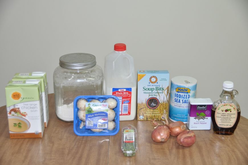 Meanwhile, whisk the milk, flour, thyme, and 1/2 teaspoon pepper together in a small bowl. Whisk the milk mixture into the soup. Add the shallots and mushrooms and cook, stirring occasionally, until soup has thickened and mushrooms and rice are tender, about 15-20 minutes. Stir in maple syrup and pepper and salt to taste.